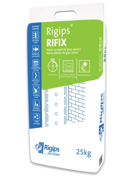 Rigips Rifix este un adeziv pe baza de ipsos destinat lipirii placilor de gipscarton pe diferite tipuri de suprafete suport (zidarie caramida plina, caramida cu goluri, BCA, beton).